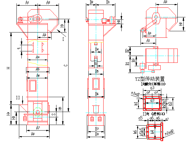 * :表中料斗容積為料斗盛水時(shí)容積。于實(shí)際填充量相近,故輸送量計(jì)算時(shí)未考慮填充系數(shù),具體選型時(shí)應(yīng)根據(jù)物料特性查表(3)求得ψ修正值以此值修正表給輸送量。 二 、提升機(jī)的結(jié)構(gòu)型式圖如下、主要尺寸參數(shù)見(jiàn)表2、傳動(dòng)裝置技術(shù)規(guī)范見(jiàn)表3. |
